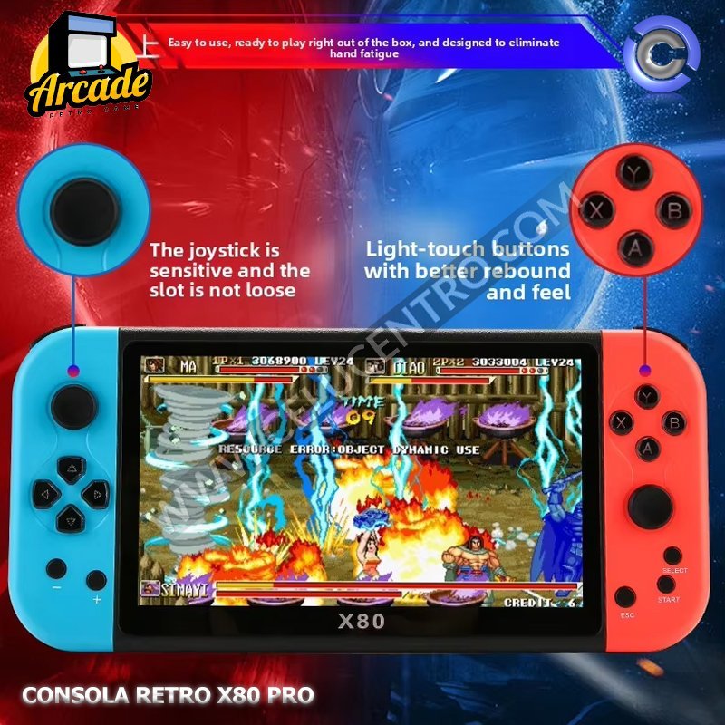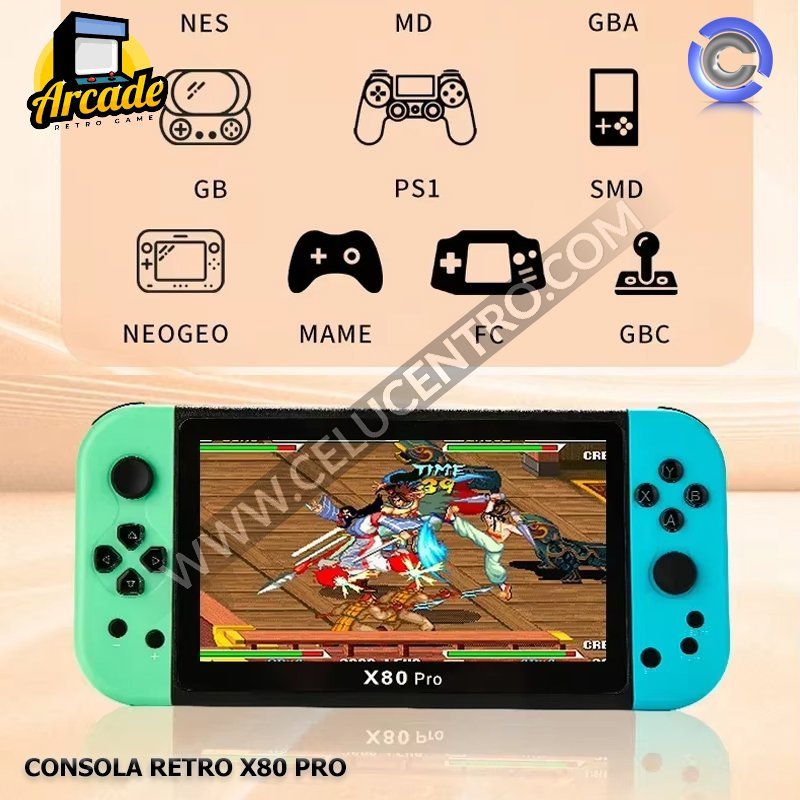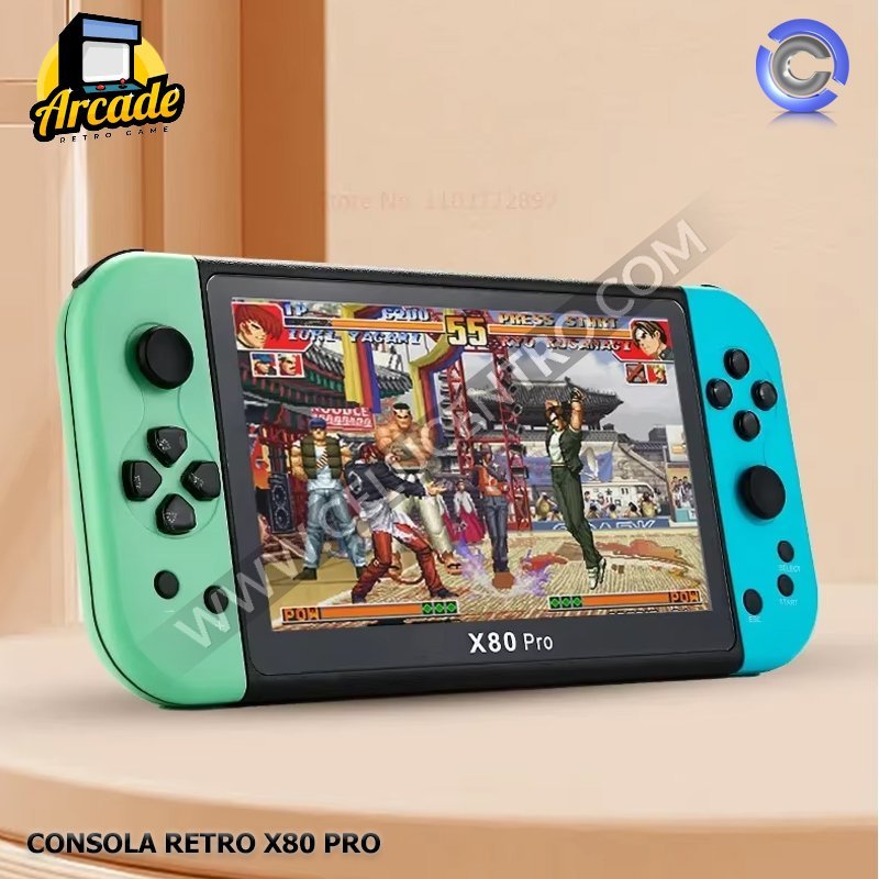 La Consola X80 Pro tiene una pantalla de 7 pulgadas HD, procesador ATM7059, 16GB de almacenamiento interno (expandible hasta 128GB), batería de 3000mAh, Wi-Fi, Bluetooth y salida HDMI, con más de 20,000 juegos integrados y soporte para emuladores, sistema operativo Linux, y un peso de 358g.